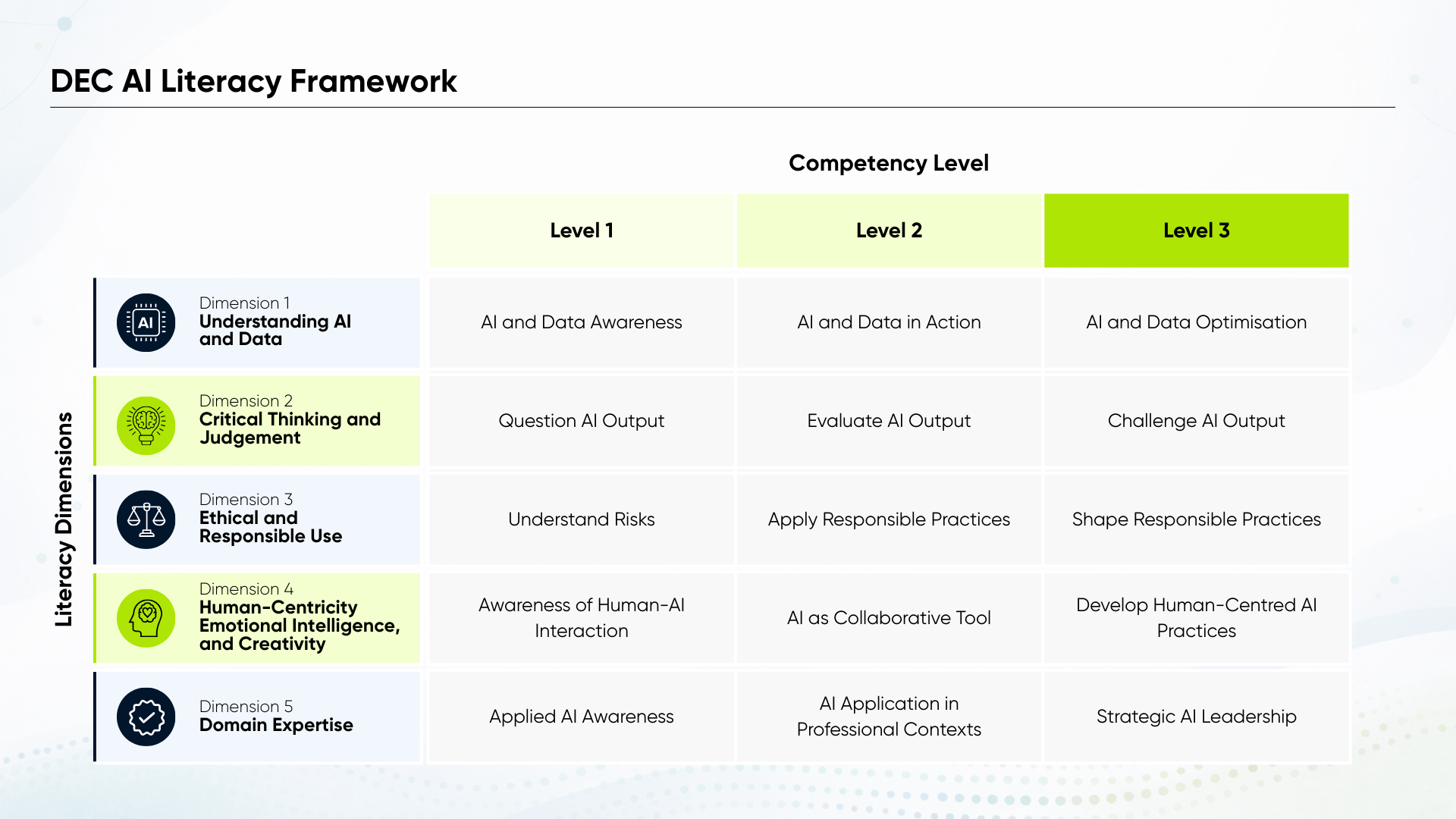 This framework takes a distinctly human-centered approach compared to many of the other frameworks we’ve reviewed. While the Alan Turing Institute’s AI Skills for Business Competency Framework focuses heavily on technical proficiency, workplace application and business value, the DEC model builds AI literacy across five balanced dimensions: