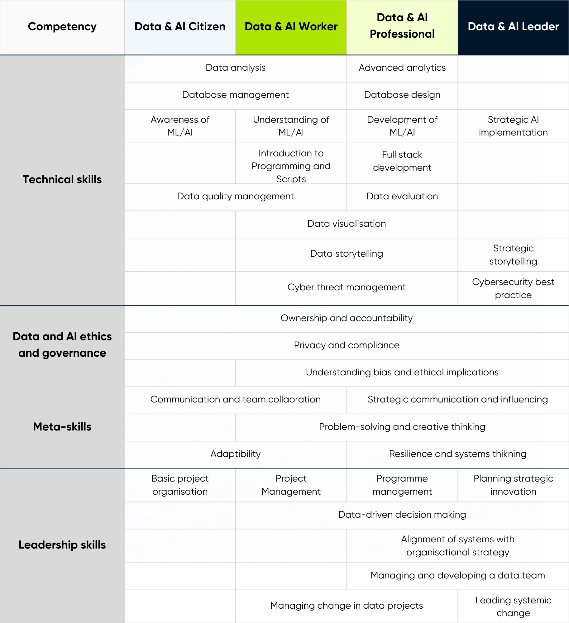 We also like how The Data Lab, Scotland’s innovation centre for data and AI, put their framework together, leaning on similar personas. You can find an image below of how they break up key competencies across personas.